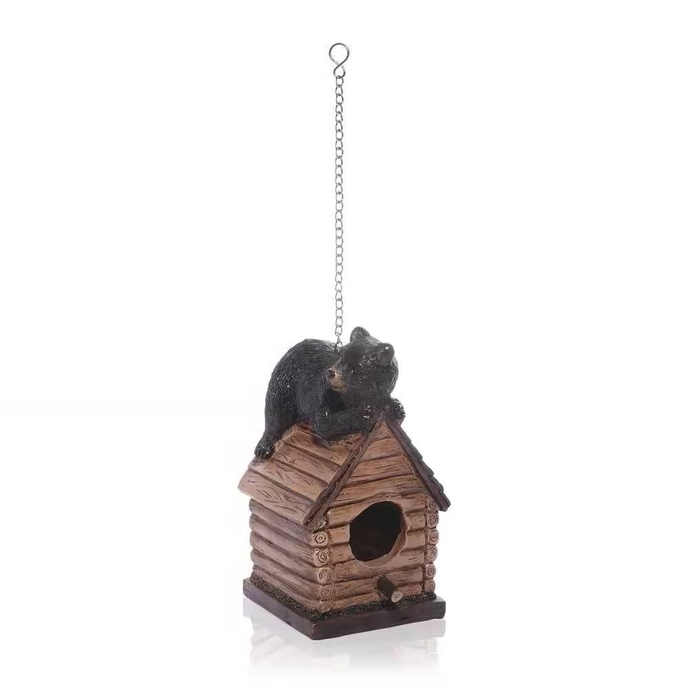 Lure all types of birds to your backyard with this Outdoor Polyresin A-Frame Birdhouse in Brown Wood Finish Bear Figurine . Enjoy watching all the birds congregate from the comfort of your couch or while at the table having dinner with your family or working on art projects with the kids. These durable birdhouses will be appreciated as a reliable place to stay for the little birds, while you get to enjoy all that enticing cuteness-buzzing wings, iridescent color, & tiny features-up close.