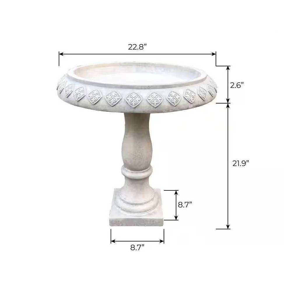 This Lightweight Weathered Concrete Fiberglass Stone Birdbath - 22-inch Diameter with a flower encased in a diamond pattern that is engraved along the rim of the bowl is a timeless piece that is pleasing to the eye and that will draw attention to your garden. A shallow and wide bowl assures that multiple small birds can drink and bathe safely at the same time. Bird bath holding water or feed can help to attract birds to stay in your yard, bird will help to aerate soil for more water and nutrients and beautify your garden lawn. Made of concrete and weather-resistant fiberglass that have all the advantages of these materials, such as strength, durability, weather and damage resistance, and long-lasting color.