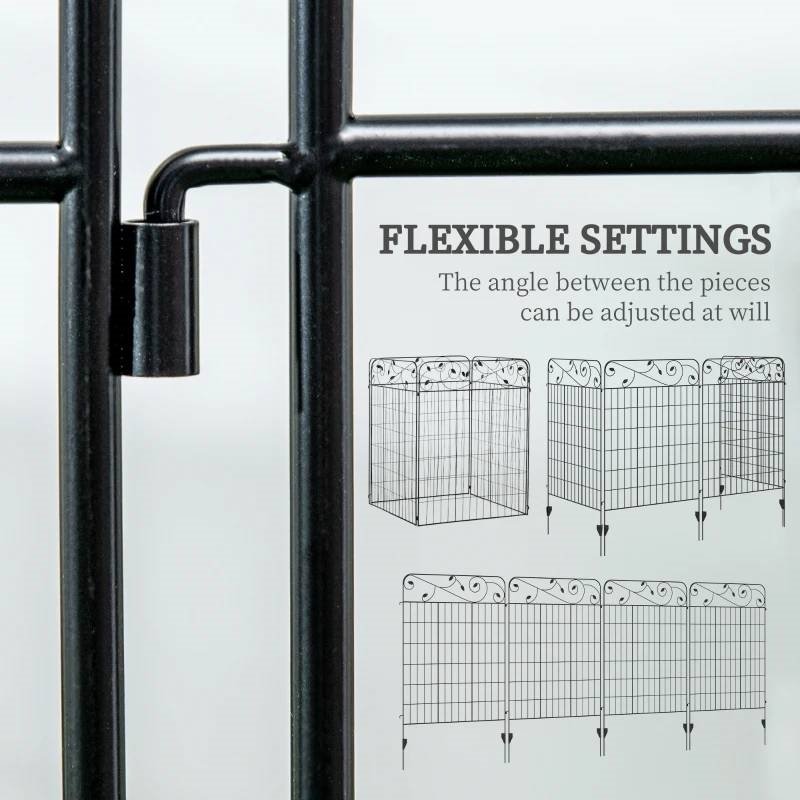 This 4 Pack Steel Foldable Fence Trelis Panel Animal Barrier comes with 4 panels per purchase, measuring 34.75" x 43.25" high. Each set of panels can reach a maximum of 11.5' long. Our metal garden fence customizes into all sorts of angles to suit your needs. Bend the four steel fence panels into shapes like an "I", "L", square, or wave. It's excellent as garden edging for flowers and as a border to another yard. This garden fencing is easy to install with no tools required. The steel panels connect with a simple interlocking design and push straight into the ground with included stakes, making them a portable fencing option.
