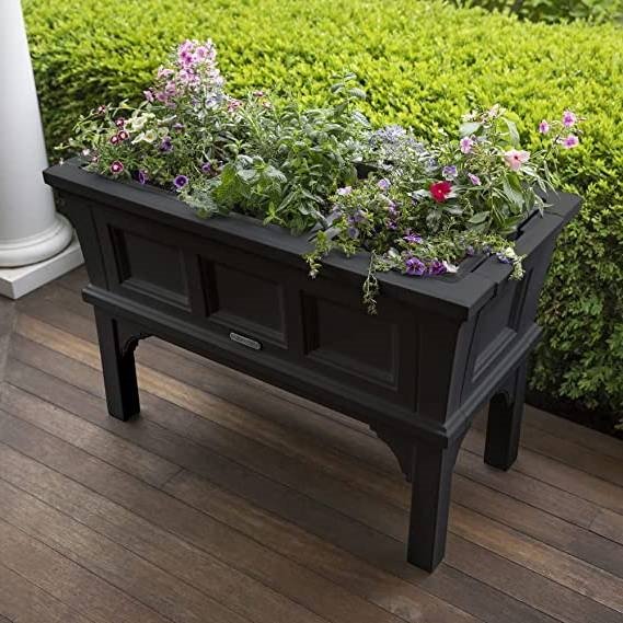 Grow big or go home! Update your home’s curb appeal with this stylish Indoor/Outdoor Black Raised Plastic Planter Box w/ Removeable Trays. The transitional style of this garden planter will become a beautiful backdrop to plants, flowers, herbs, or vegetables for years to come. 3 removable planter trays simplify planting and arrangement of flowers and greenery. Removable trays require less soil than traditional pots, keeping the planter light and easy to move. It sits 24 inches off the ground for easy watering and plant maintenance. The resin, semi-gloss finish won’t chip, splinter, fade, rust, or tarnish. The resin planter box features DIY four panel assembly that can be accomplished with a few common tools (not included). Assembled dimensions: 24 in. x 39 in. x 19.5 in.