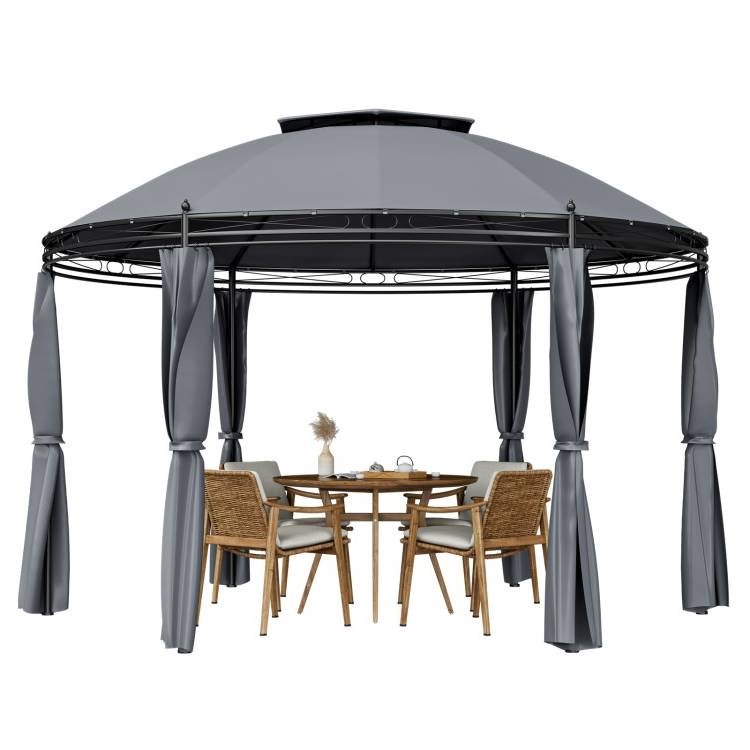 Enjoy all of outdoor leisure time and escape the elements with this Circular Dome Hexagon Gazebo w/ Polyester Privacy Curtain in Grey. This patio gazebo has a double-roof design that facilitates convection and circulation of hot and cold air, promoting good ventilation and keeping cool under the gazebo. This outdoor steel gazebo is equipped with 6 side curtains, which is connected by hook and loop fasteners. They are removable with convenient hooks and can be easily put down to provide excellent privacy. When you don't need to use them, you can store the curtains to one side with hook and loop fasteners to provide full ventilation. This 11.5 ft x 11.5 ft outdoor gazebo has an elegant round shape, which is perfect for any outdoor decor, such as patio, courtyard, garden, deck, etc. In addition, the spacious gazebo is enough to accommodate 4-5 people for dinner, gathering or chatting under it. The top of this gazebo is made of 160g high-quality polyester cloth with waterproof PA coating and the curtains are made of 130g polyester cloth.