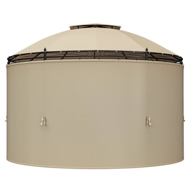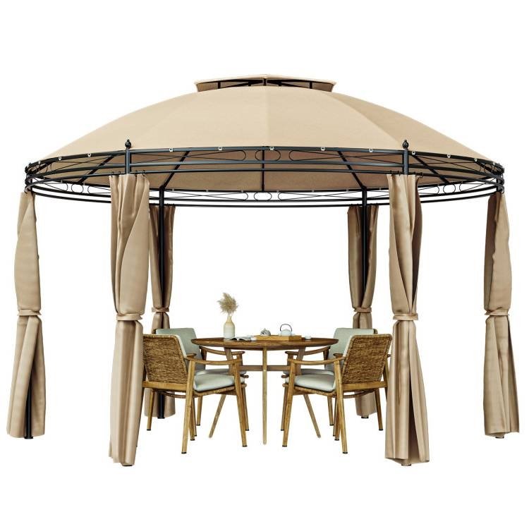 Enjoy all of outdoor leisure time and escape the elements with this Circular Dome Hexagon Gazebo Canopy with Polyester Privacy Curtain in Brown. This patio gazebo has a double-roof design that facilitates convection and circulation of hot and cold air, promoting good ventilation and keeping cool under the gazebo. This outdoor steel gazebo is equipped with 6 side curtains, which is connected by hook and loop fasteners. They are removable with convenient hooks and can be easily put down to provide excellent privacy. When you don't need to use them, you can store the curtains to one side with hook and loop fasteners to provide full ventilation. This 11.5 ft x 11.5 ft outdoor gazebo has an elegant round shape, which is perfect for any outdoor decor, such as patio, courtyard, garden, deck, etc. In addition, the spacious gazebo is enough to accommodate 4-5 people for dinner, gathering or chatting under it. The top of this gazebo is made of 160g high-quality polyester cloth with waterproof PA coating and the curtains are made of 130g polyester cloth.