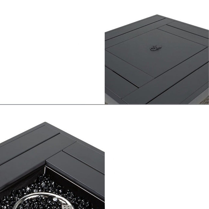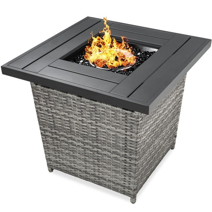 Make your winters warm and cozy outside with this 50,000 BTU Grey Wicker LP Gas Propane w/ Faux Wood Tabletop and Cover. Use a 20-pound propane tank to fill your patio or sitting space with fully adjustable, radiant heat for hours of outdoor enjoyment. Propane tank not included. Convenient gas tank holder is attached to the magnetic side door, so you can quickly change and conceal your propane tank. High-quality, weather-resistant wicker is woven over a sturdy, steel frame, with a durable fabric cover to ensure this fire pit table will withstand the elements. Take the lid off the built-in side hooks and cover the pit to add more space for family and friends to enjoy a light meal. Ignite an inviting flame over a removable bed of glass beads that trap and disperse heat while resisting corrosion.