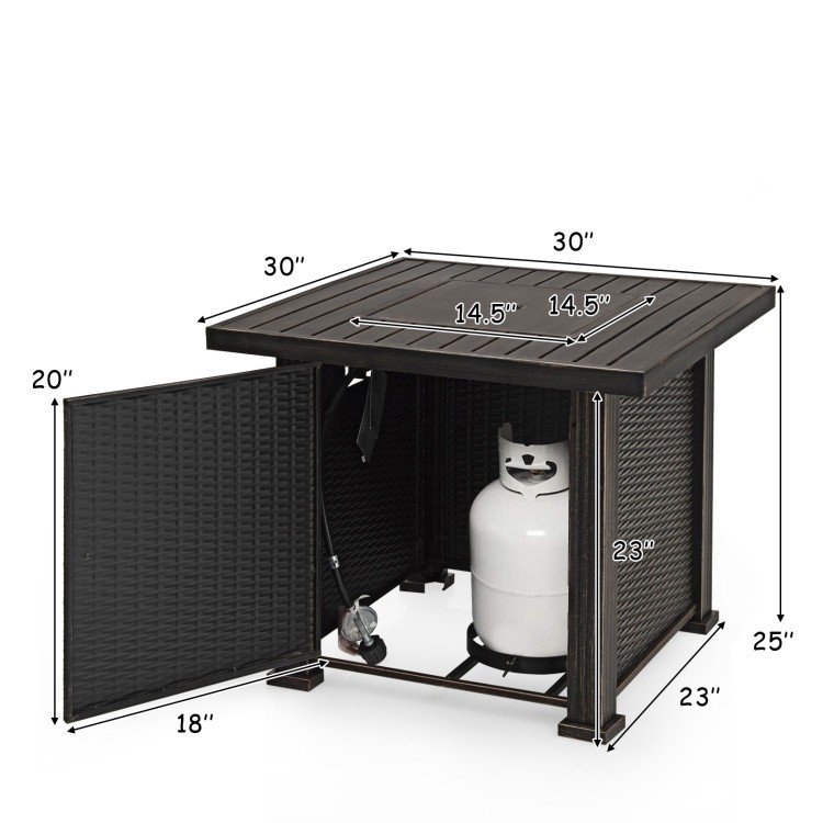 This durable 50,000 BTU Square Propane Gas Fire Pit Table with Table Cover is a versatile piece of patio furniture that you'll find yourself using all year round. Sturdy and stable steel material provides strong durability. Equipped with electronic ignition and in-built control panel. Table cover with pull-tab for convenience. Lava rocks included to beautifully accent the flames. Door with handle for hidden the inner space. Suitable for 20 lbs. propane stove. Assembly Required. Propane tank NOT included.